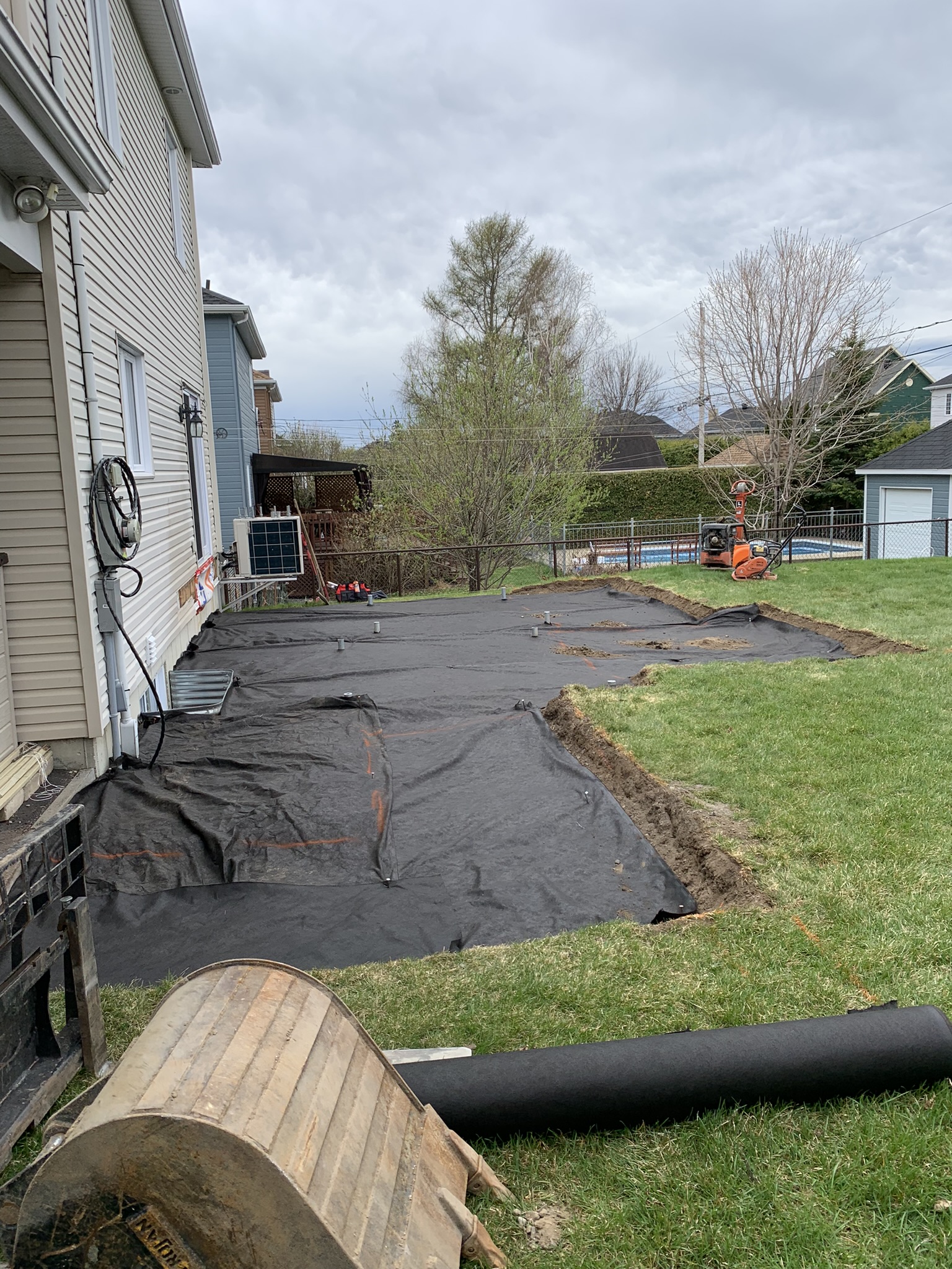 Dérouler un géotextile avec pierre nette pour couper l’humidité sous le patio